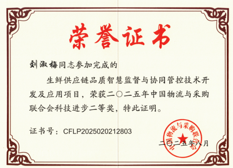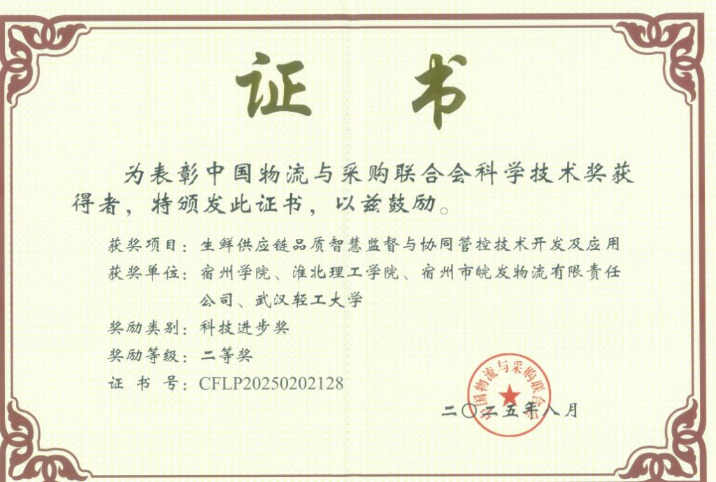 近日,2025 年度中国物流与采购联合会科学技术奖获奖名单揭晓,我校作为第二完成单位与宿州学院、宿州市恒发物流有限责任公司、武汉轻工大学共同申报的“生鲜供应链品质智慧监督与协同管控技术开发及应用”项目,荣获科技进步奖二等奖。
