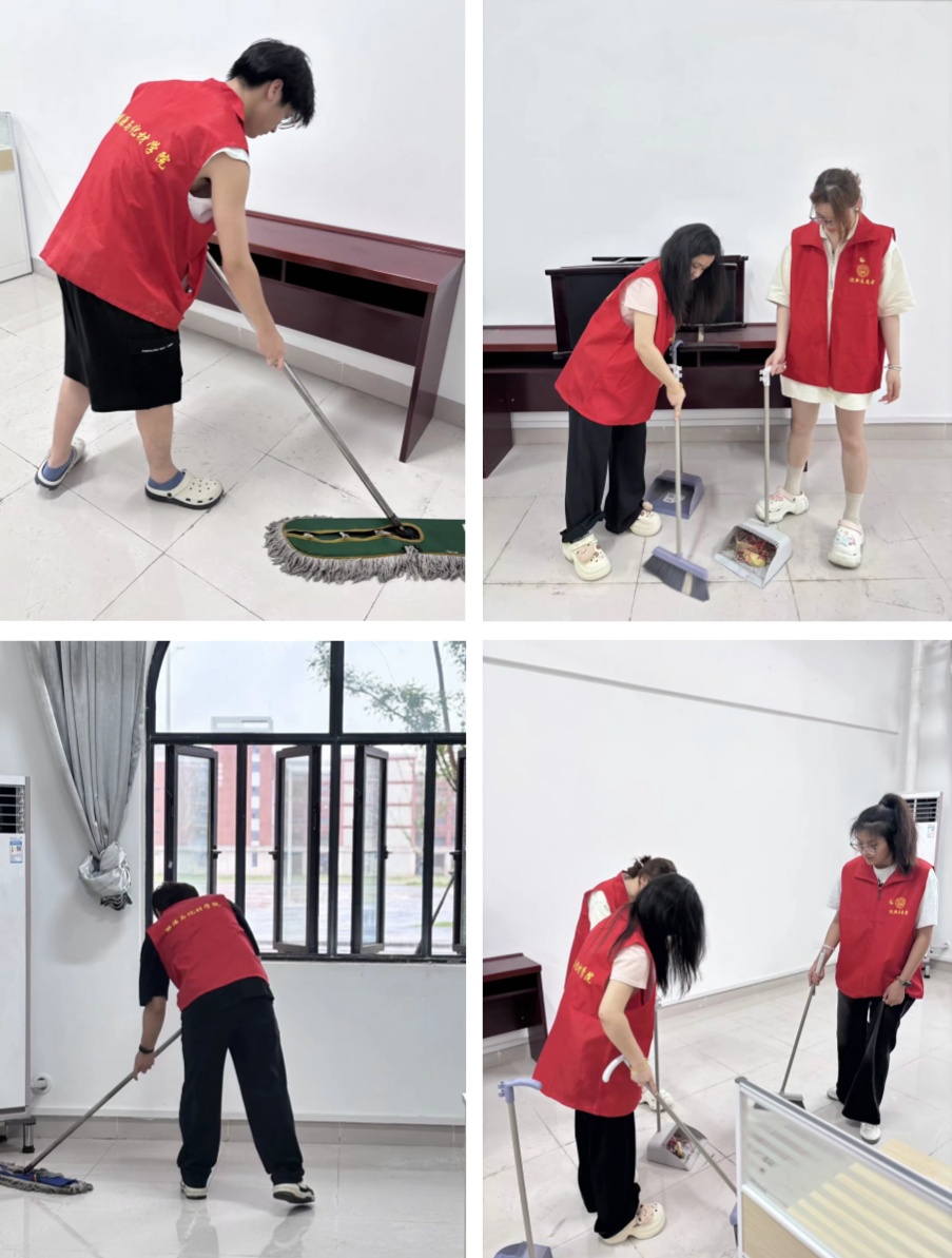 在材化楼办公区,同学们分工协作,迅速投入到清理工作中。他们手持抹布,仔细擦拭办公桌椅、文件柜,不放过任何一个污渍,让办公环境变得整洁有序。在卫生区,同学们充分发扬不怕苦、不怕累的精神。他们拿着扫帚等工具,认真清扫道路上的落叶、纸屑,弯腰捡拾绿化带里隐藏的垃圾。大家相互配合,忙碌的身影成为材化楼一道亮丽的风景线。