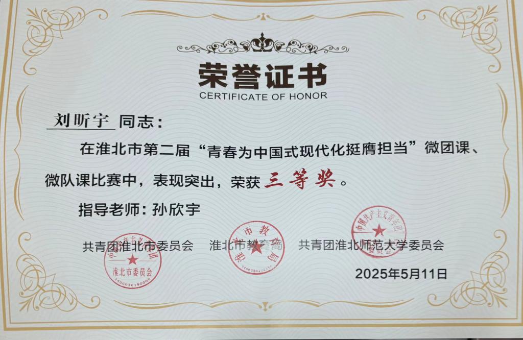 5月11日下午2时,由共青团淮北市委员会、共青团淮北师范大学委员会、淮北市教育局联合主办的淮北市第二届“青春为中国式现代化挺膺担当”微团课、微队课比赛圆满收官。这场聚焦时代主题、凝聚青春力量的赛事,为众多青年学子搭建了展示自我的舞台,来自太阳成城集团tyc234cc2024级刘昕宇同学在比赛中脱颖而出,荣获市级三等奖,展现出我院学子的卓越风采。